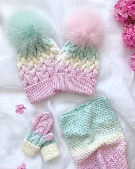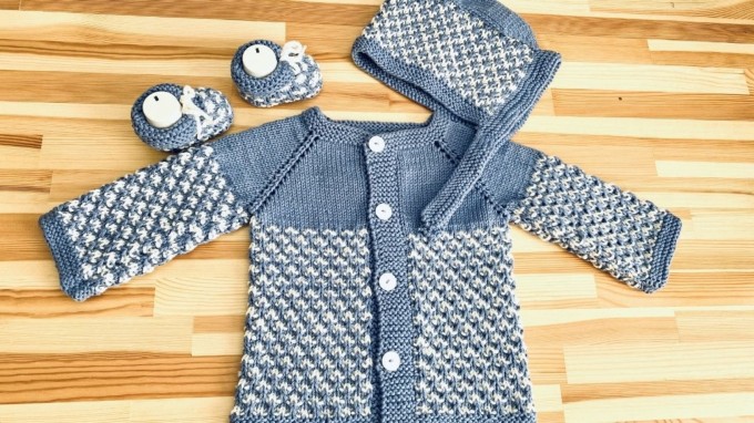 Hello these days, I love the 2 COLOR HOODED BABY CAP, which is part of our baby suit, you should definitely knit the beresin if knitting the cardigan and booties. I used an old sweater to reattach and a snowball axoft yarn as the rope so you can knit it easily. You can knit with threads of this thickness. It will be smaller with finer threads.