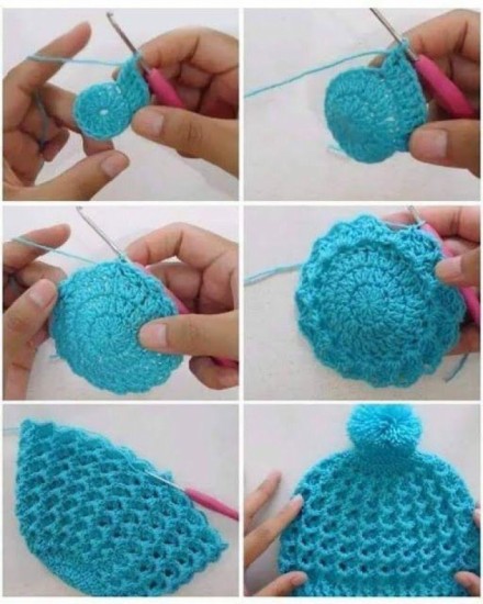 Again three chains to grow the fabric, for the third round double crochet without increase and the next two double crochets in the same stitch, this sequence until finishing the round, there are designs that at a certain moment the stitch is changed, usually This beginning is for all kinds of designs, many simple ones are made with only sequences of two high stitches in each stitch, when it comes to crochet hats in 3d, stitches similar to those seen in the following photograph are usually used.