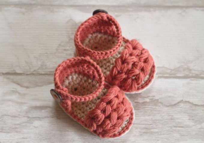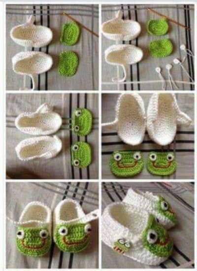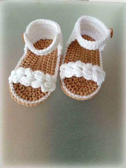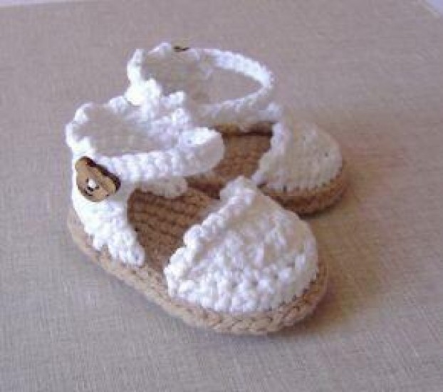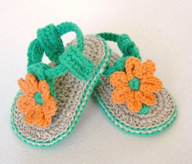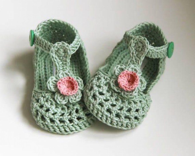 Knitting Baby Sandals We prepare some very beautiful green and gray ankle boots. Manufacture of baby sandals with narrative. You can weave it with linen threads, cotton threads, mercerized threads. A very nice and pretty example. We will need 2 wooden buttons, crochet, thread and needle to sew the crochet. Now we will knit 4 bases according to the following scheme.