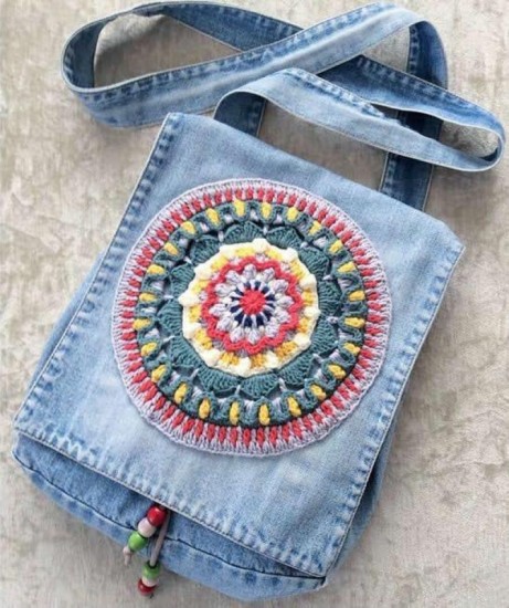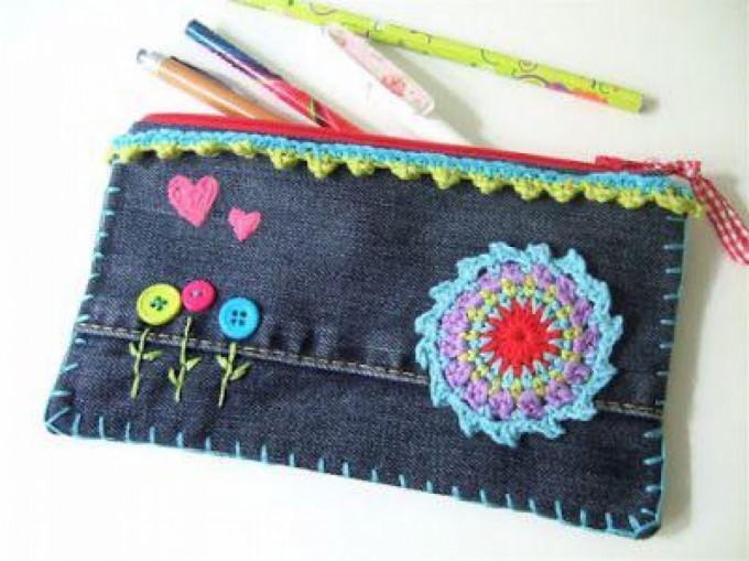 Even if you don't have a sewing machine, you can make small purses with hand stitching, combining them with crocheted fabrics, and you can make fancy purses and makeup bags for your little girls. You may need to go step by step first. You can cut your old jeans with scissors and prepare them from the front. Then you can draw and cut the pattern you have drawn on the jeans to leave a seam allowance. Combine the 3 edges of the two fabrics that you have cut on the reverse, you can choose a zipper as an accessory or make a cover with pieces of fabric and finish your design with a button on the top. You can have unlimited design in old denim renovation recycling projects Decorating ideas are among the most popular designs especially.