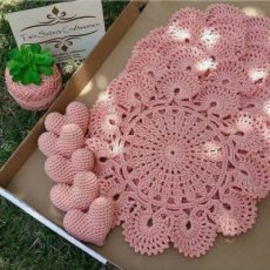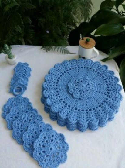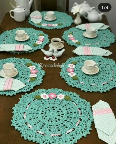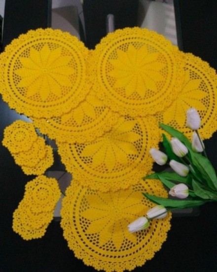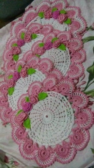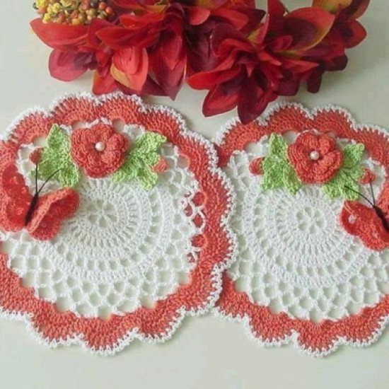 MATS IN RED POINTS This filet crochet technique can also be combined with different stitches apart from double crochet and chainstitch. For example, you can crochet pineapple folders, net stitches, lace, fans and picot to finish the lace.